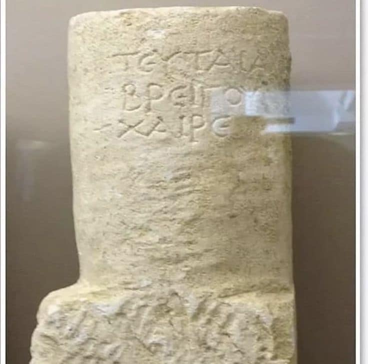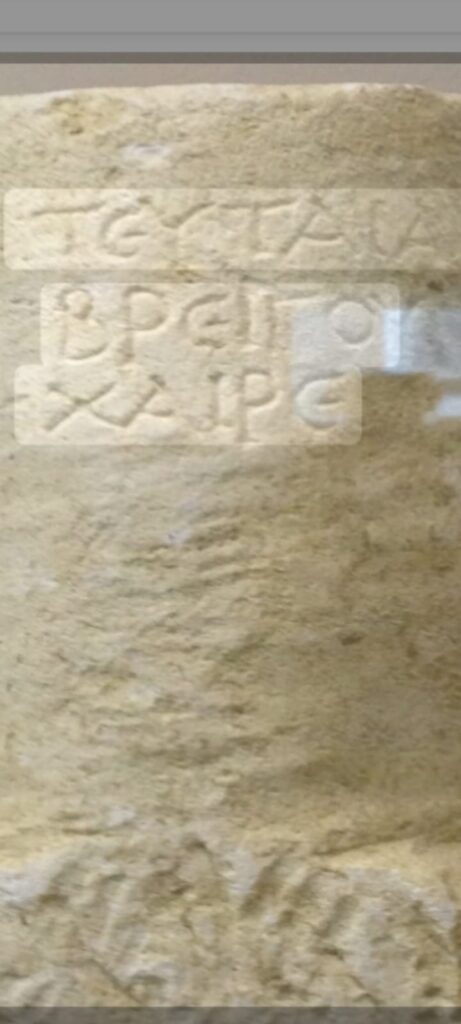 Mbishkrim i një gurë varri I gjetur në Necropolin e Kokomane në Durrës, ku shkruhet: TEUTAIA BREIGOY XAIRE