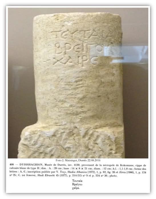 408 DYRRHACHION, Muzeu Durres, inv. 4130, nga nekropoli i Kokomane, çip gëlqeror i bardhë i tipit B; i zbehtë. h.: 39 cm; baza: 14 x 8 x 21 cm; diametri: 12 cm; lartësia: 1,1–1,8 cm; forma e shkronjave: A, €; mbishkrim i botuar nga V. Toçı. Studime Shqiptare (1972), 1, f. 82, fig. 26 dhe Iliria (1986), 1, f. 124 1o 25: C. DE SIMONE, Studime etruske 45 (1977), f. 214–215 n 9 et f. 224 nr 36; foto.